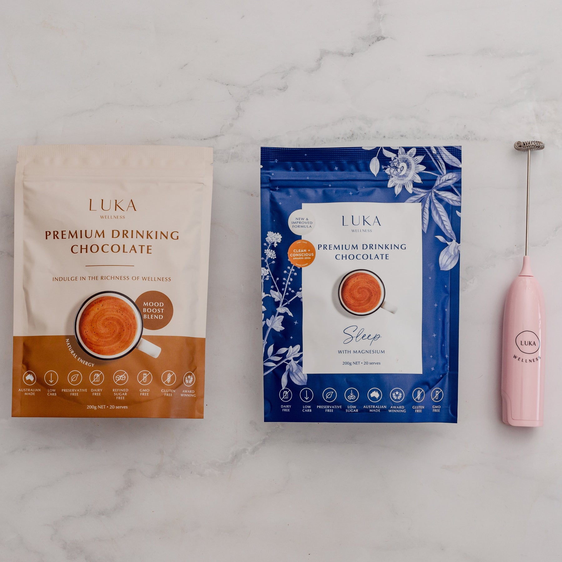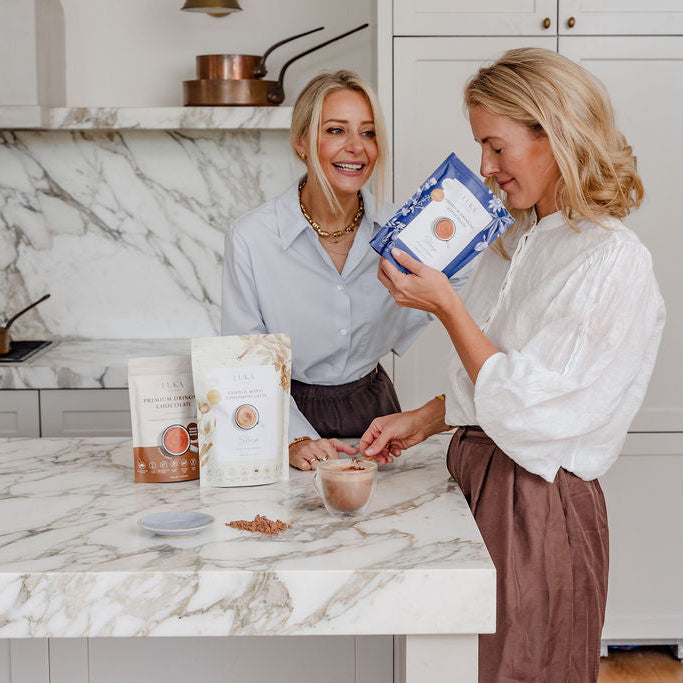 The LUKA Mood Boost Blend delivers a rich, plant-based drinking chocolate crafted to uplift your mood and nourish your body with every comforting sip.
